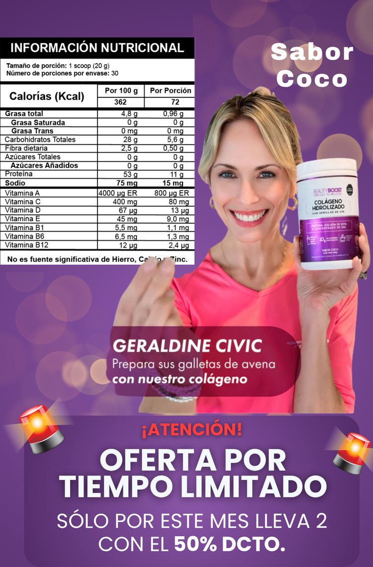 Cada porción de 20 gr. contiene 10 gr. de colágeno hidrolizado.